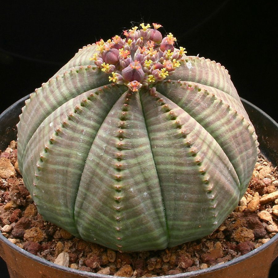 Unlike cacti, Euphorbia obesa contains a milky sap typical of the Euphorbia family. It rarely grows taller than 10–15 cm and remains compact, making it ideal for shelves, windowsills, or modern minimalist arrangements. In mature plants, small yellow-green flowers (cyathia) appear at the top of the stem, adding delicate beauty to its geometric form.